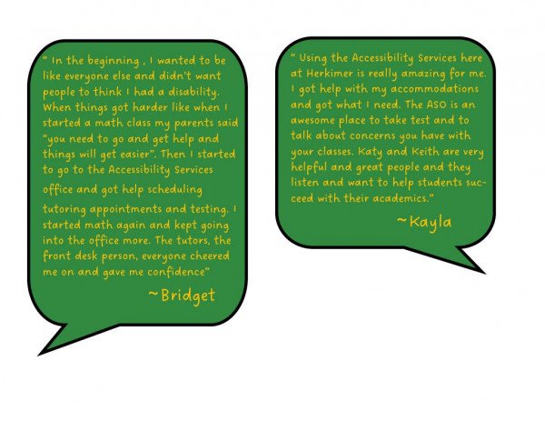 Transitioning from high school to college is difficult enough for students. For students with disabilities, this may be even more of a challenge. Students who had services available in high school may be reluctant to use those in college. Students with disabilities are always welcome to go to the Accessibility Services Office within the Academic Support Center to use the services available. Services include Sign language interpretation, assistance with notetaking or e-notes, someone to be an advocate to help set up alternative testing arrangements, or even a point in the right direction for other services located on campus or in the community. To receive these services, students must be registered with the Accessibility Services Office.