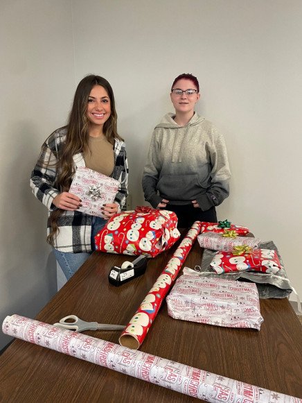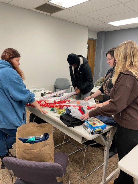 Professor Calli's Abnormal Psychology class members, from left to right, Olivia Gasparinatos, Nehemie Fleurimond, McKayla Ganci, and Brooke Lindfield spend time wrapping gifts.