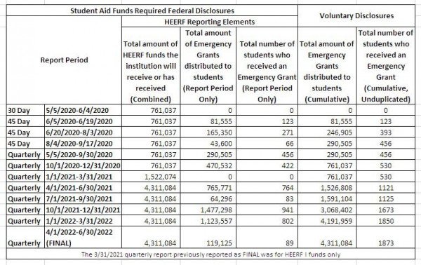 Below is the combined quarterly reporting summary for the HEERF Student Aid Funds made available through CARES, CRRSAA, and the ARP satisfying the required reporting elements number 2, 3, and 5 listed above.