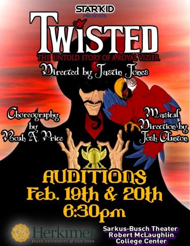 Herkimer College will hold auditions for Starkid’s production of Twisted: The Untold Story of a Royal Vizier on Monday, February 19, and Tuesday, February 20 at 6:30 p.m. in the Sarkus-Busch Theater located in the Robert McLaughlin College Center, room 247. Faculty, staff, students, and the greater community are welcome to audition.